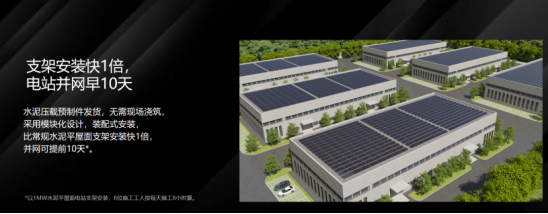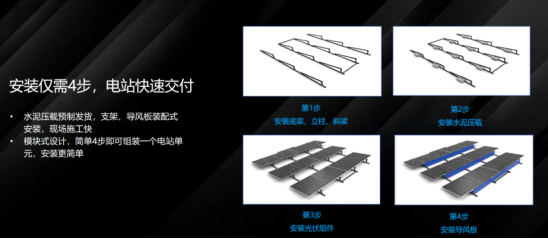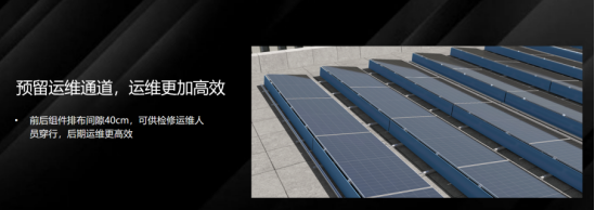 为助力EPC伙伴安装流程顺畅,设计上采用简单装配,水泥压载预制发货,支架、导风板装配式安装;模块式设计简单高效、施工快,安装仅需4步,提高电站交付速度;同时预留运维通道,前后组件排布间隙40cm,可供检修运维人员穿行,后期运维更便捷。