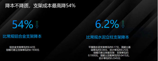 从技术上降低成本,以实现降本增效,帮助业主早并网早收益。「巧客立」快装支架系统降本不降质,支架成本最高降54%;标准化、模块化设计安装,比常规水泥平屋面支架安装快1倍,可提前10天并网;采用10°黄金倾角设计,充分利用每一寸屋顶,实现装机最大化,创造更大收益。