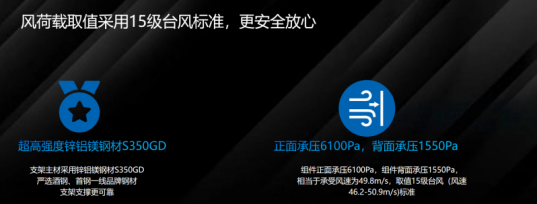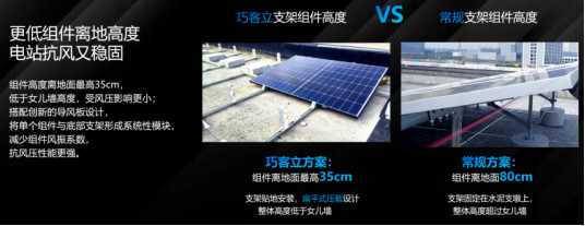 从研发上优化品质,相较于常规组件方案,「巧客立」方案运用更低组件贴地安装,离地面最高35cm,受风压影响更小,搭配创新的导风板防护,将单个组件与底部支架形成系统性模块,抗风压性能更强;在混凝土压载上,相比1MW常规支架而言,1MW「巧客立」支架C25素砼用量减半,用量仅需60m³,大幅度为屋面“减压”;材料上严选超高强度锌铝镁钢材S350GD,使用酒钢、首钢一线品牌钢材支架支撑,风荷载取值采用15级台风标准,安全可靠。