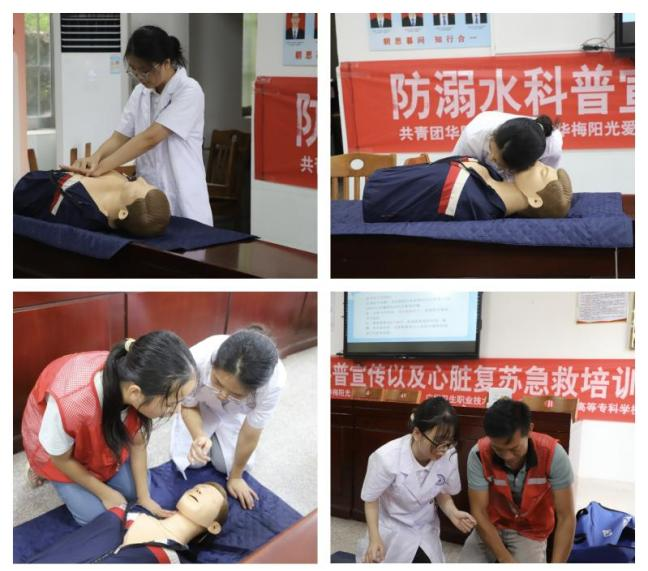 7月29日,两校突击队员们与来自华阳镇华梅阳光爱心服务队的30余名大小志愿者共聚一堂,开展以“不做孤泳者”为主题的防溺水科普宣传及心脏复苏技术现场培训,并共同组成巡查队伍,对镇上河堤进行全面细致的巡查工作。突击队员们指导志愿者学习了心肺复苏(CPR)的基本步骤及溺水后的紧急救援技巧。从判断意识、启动急救反应系统,到胸外按压、打开气道、人工呼吸,每一步都力求准确到位。溺水事故就发生在我们身边,基层防溺水教育任重道远,志愿者和突击队队员们通过劳动实践,将防溺水知识真切地传递给更多基层民众,成功劝阻的每一个游人,每一句谢谢,都让队员们切实感受到自己为乡村安全贡献的一份力量,感受到劳动服务带给社会的价值。