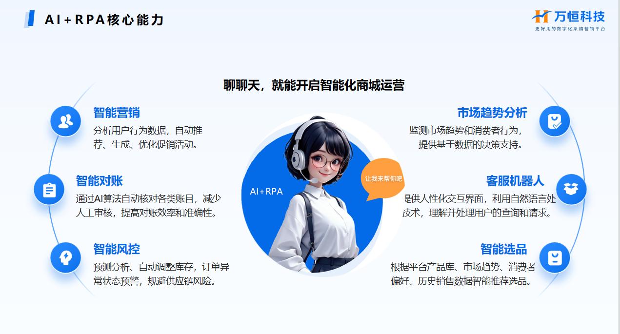 万恒科技致力于用前沿的人工智能技术,为客户提供AI采购营销解决方案,提高客户运营效率和商业价值,实现数字化转型。在人工智能、大数据计算与分析、RPA等方面不断探索,通过先进技术能力与应用场景的不断融合,为客户创造更广泛的商业价值。万恒科技为金融、地产、民生、能源、汽车、航空、电子科技、政务平台等行业提供数字化升级解决方案。公司已成功链接超1000万+SKU商品,服务1000+客户,累计触达用户超过2.6亿。
