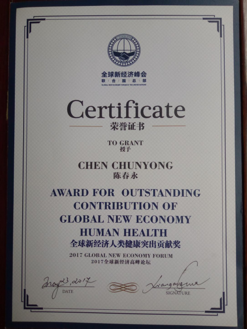 2017年受邀于联合国总部作中医学术传承报告,并荣获“全球新经济人类健康突出贡献奖”。