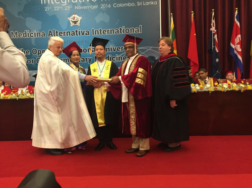 五、于2016年11月20日受邀前往斯里兰卡科伦坡参加由世界传统医药保护与发展委员会、世界卫生组织传统医药中心、国际交流医科大学,斯里兰卡政府联合主办的“第54世界传统医学大会”。作为中国中医代表团代表应邀在主席台做《火针治癌》的学术成果报告!因在“火针治癌”的学术成果及肿瘤外冶法对社会做出贡献,被大会组委会授予“世界传统医学杰出贡献奖”!