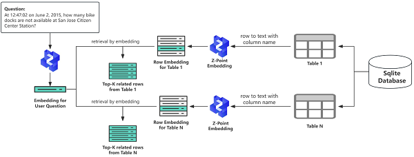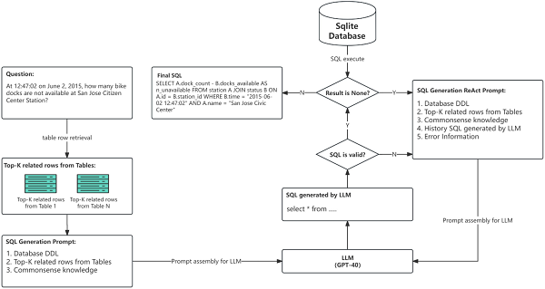针对本次评测任务,诺谛智能AI算法组采用基于检索增强的SQL生成,该方案核心过程包括行数据检索和基于ReAct机制的SQL生成两个主要阶段。在行数据检索阶段,会根据用户问题从目标数据库中的各个表内检索与用户问题最相关的K行输入作为样例整合到SQL生成的指令,为大模型生成SQL提供最相关的数据输入,从而提升SQL生成的正确率。