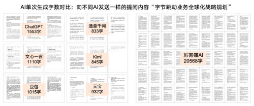 比如,以撰写 " 字节跳动业务全球化战略规划 " 为例,在各大 AI 产品输入框中输入这一指令,会得到不同的文本内容,根据结果对比发现,所有主流 AI 输出的字数在 800-1600 之间,而厉害猫 AI 的文本内容字数最长,达到 20568 字。