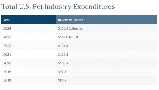 放眼全球宠物市场体系,美国占据的市场份额依旧是该行业中的TOP 01。宠物协会(APPA)近日的数据透露,美国去年在宠物上的支出达到了1470亿美元,预计今年将增长至1506美元美,到2030年有望超过2500亿美元。