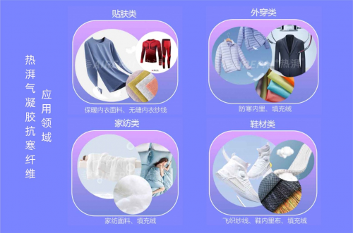 热湃®气凝胶蓄热抑菌纤维/纱线,天材料二氧化硅气凝胶低密度、低热导率、高孔隙率的科技抗寒、隔热、超轻特征,融入生物活性因子吸光发热、生态抗菌、保湿护肤健康特性,通过专利微气态混合制备技术,解决了气凝胶、生物氨基活性因子、聚合物之间充分相融和固化问题,成功制备出集力学柔韧性能、气流存储性能、热量转化性能俱佳,且具有生物源健康环保特性的一种轻量化多维纳米微孔蓄热锁温科技功能新材料;具备材质轻盈、蓄热锁温、持久抑菌、导湿透气等特质,隔热性能是棉布的5倍以上,纤维保温率优于羊绒材质,在-20℃以下极端环境下可长时间发挥隔热保温性能,入选2024/2025中国纤维流行趋势代表产品;可广泛应用于航天、军事、工业、民用、运动装备、科技穿戴等领域。