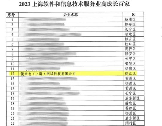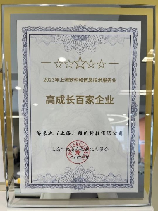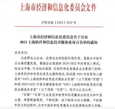 为发挥龙头企业、优势企业的创新引领作用,鼓励上海市软件企业高质量发展,根据企业填报的2020-2022 年经营收入情况,经企业申报、行业协会推荐、区软件和信息服务业主管部门初审,上海市经济和信息化委员会最终核定——俺来也(上海)网络科技有限公司荣获“2023上海软件和信息技术服务业高成长百家”称号。
