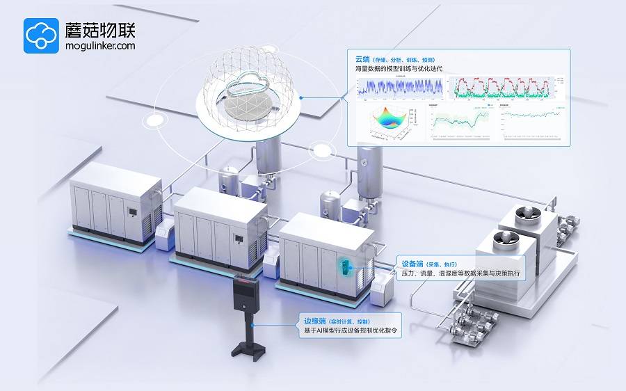 在节能降碳的制造环节中,海信视像江门工厂通过由蘑菇物联提供的AI云智控节能管理系统,通过灵知AI大模型代替人工经验管理和控制,实现了空压站和制冷站等公辅车间的数智化转型与节能降碳。