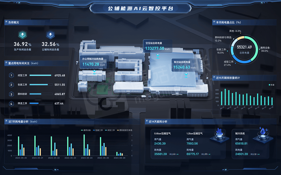 在实践应用过程中,AI云智控系统能够精准采集设备运行数据,建立数据模型,系统及时地根据生产用能需求调整能源供给,实时智能控制能源供给侧设备运行,确保设备处于最佳运行状态。在保障安全供能的前提下,实现工厂能耗下降超15%,累计减少约885吨二氧化碳排放,让其成长为行业零碳排放的门面担当。