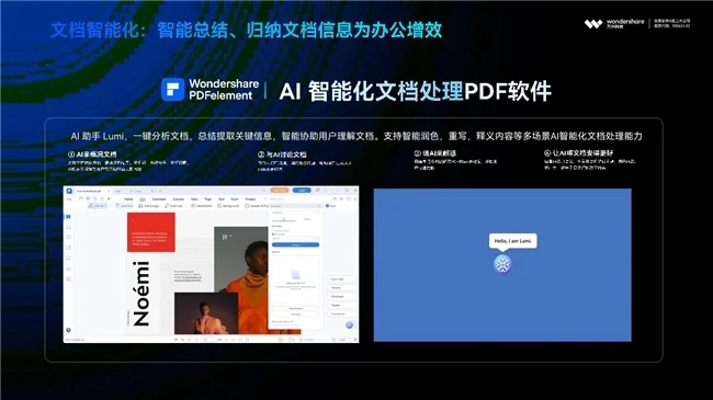 在数字文档解决方案方面,万兴科技旗下万兴PDF已全端上线AIGC功能,推出AI机器人助手Lumi,支持一键分析、AI总结、智能翻译、智能检查、智能润色等多种AI功能。该解决方案符合工业级文档格式标准,可确保文档安全、专业、完整,同时可通过AI助力文档批量处理,简化数字办公工作流,提升信息获取与沟通效率,助力夯实数字化办公基础。