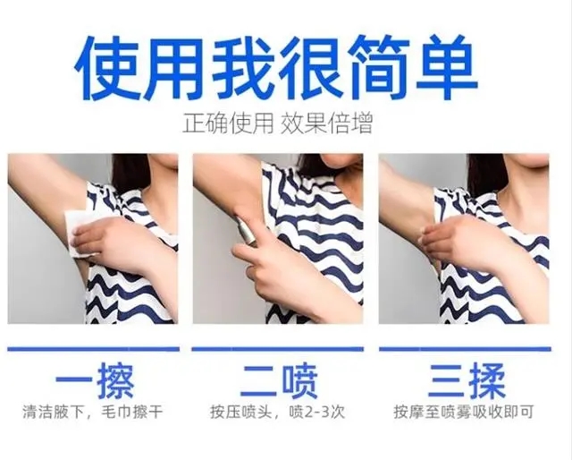 使用之前清洁下腋下皮肤,擦干,每次喷3下(充分喷出)。