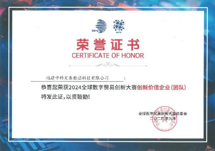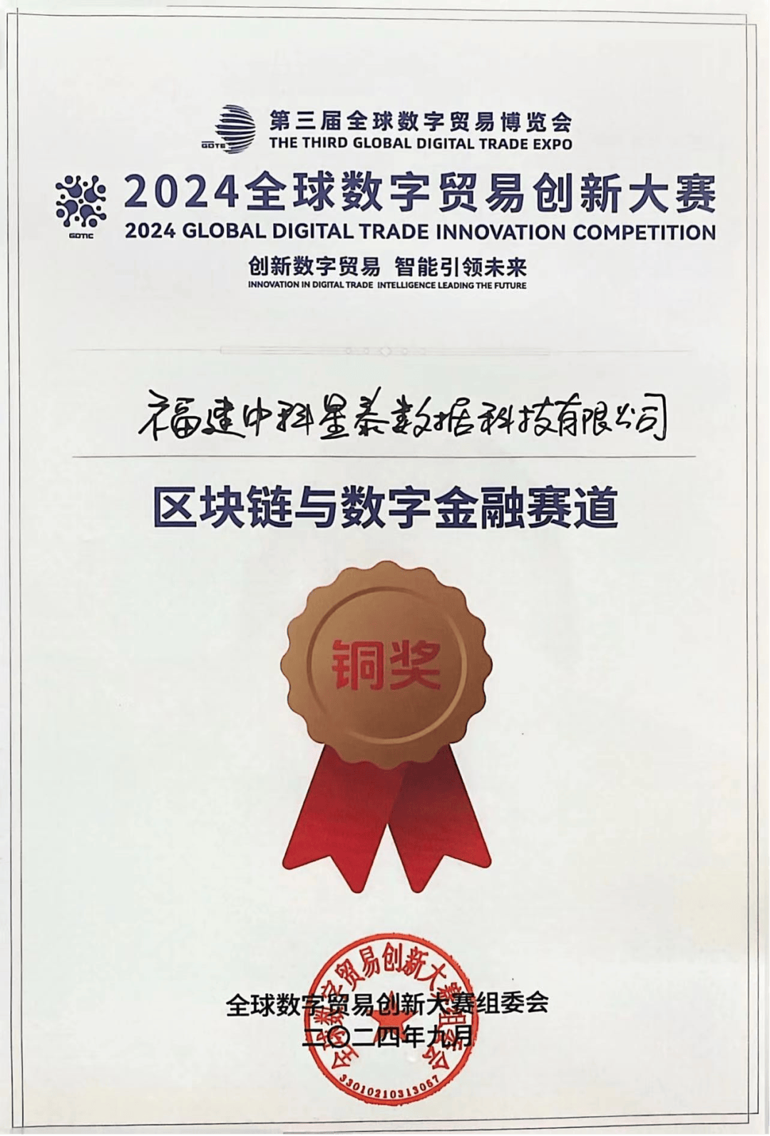 9月28日,2024全球数字贸易创新大赛(以下简称“数贸大赛”)在杭州落下帷幕。经过初赛阶段的层层筛选,福建中科星泰数据科技有限公司与来自全国各地20余家企业同台竞技。经过激烈角逐,福建中科星泰数据科技有限公司的“盈链汇”ERP系统荣获“区块链与数字金融”赛道铜奖,并荣获“创新价值企业(团队)”荣誉。