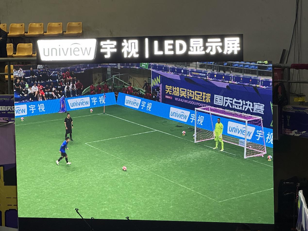宇视科技提供近200㎡室内外LED显示屏,包括转播大屏、围栏屏等,具备高清显示、可靠耐用等特点。现场转播大屏作为精彩放送主力军,身兼数职,用于赛况信息播放、实时直播同步、计分展示、精彩回放等,打造沉浸式超高清观看体验;围栏屏则成为赛场最佳气氛组,用于进球特效、商业广告、赛事信息播放等,打造“环绕式”显示场景,为赛事增添一抹亮色。