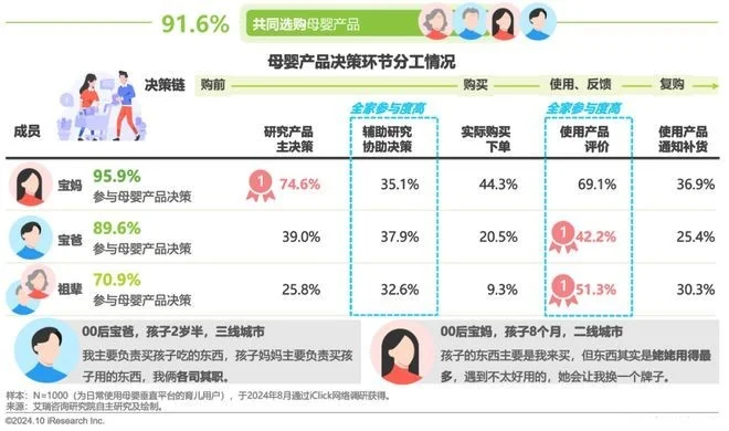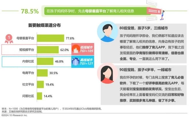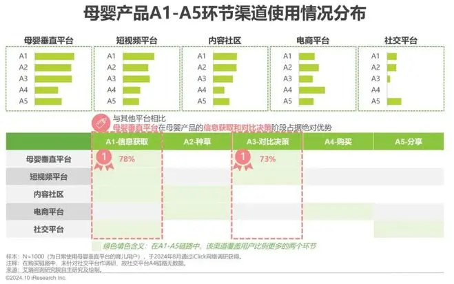 在母婴新消费市场中,众品牌卷种草卷带货,母婴垂直平台、短视频平台、内容社区、电商以及社交平台等渠道各具特色,各有侧重。据《2024年中国家庭育儿行为及营销价值洞察》,除了满足母婴人群获取知识、工具使用、交流互动等育儿服务需求,母婴垂直平台在母婴产品信息获取和对比决策环节仍占据主导地位,其强大的种草力对母婴人群在全渠道的消费决策具有重要影响力。