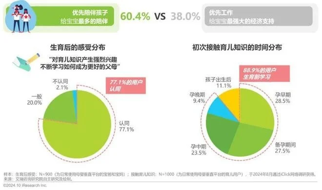 与此同时,为实现高质量养育,催生了一大批“未雨绸缪”型父母,他们会提前主动学习育儿知识,88.9%的用户从生育前就已开始接触育儿知识,不断学习如何成为更好的父母。