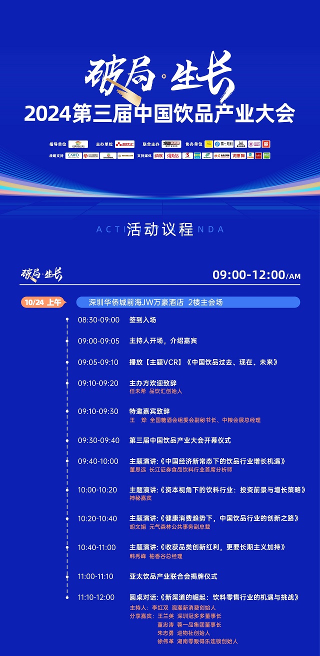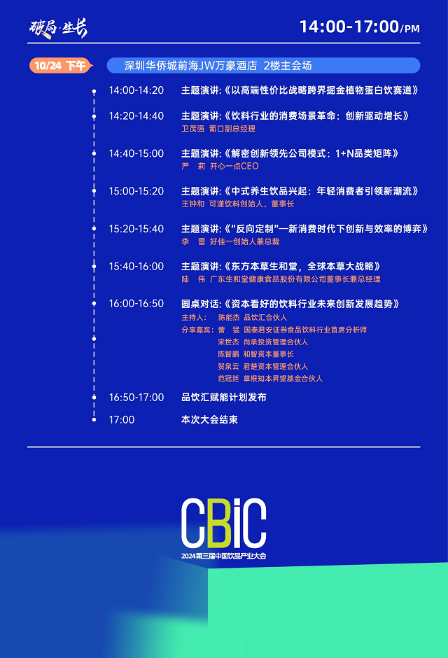 10月24-27日,以“破局·生长”为主题的“CBIC2024第三届中国饮品产业大会”(以下简称“产业大会”)将在深圳前海华侨城JW万豪酒店举行。本届饮品大会由品饮汇、观潮新消费联合主办,通过产业大会、决策者选品会、闭门私享会、秋季饮品主题展等多个特色主题活动,助力饮品全产业链达成深度沟通与目标对接,共同叙写中国饮品产业于存量时代中的破题之道。