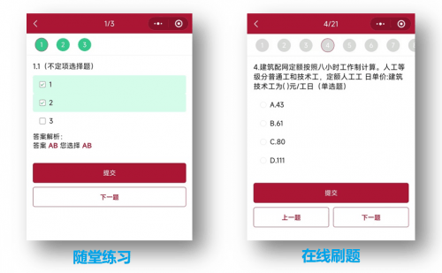 在线学习的过程中,用户可随时参与随堂练习,巩固所学知识;同时,丰富的题库资源让用户能够自由无限刷题,提升解题能力。