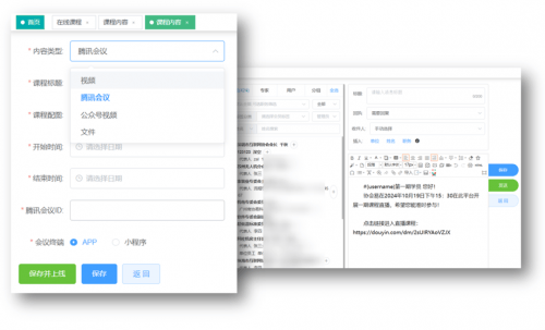更重要的是,系统还与腾讯会议打通,有的协会有实时培训的需求,就可以在后台设置好腾讯会议的ID,方便学员能够直接进入腾讯会议开展实时培训课程。如果是使用如抖音等其他第三方直播平台,我们也能够以消息通知的方式,附带上第三方直播工具的链接,直接通知到学员,跳转到第三方平台直接开始培训学习。