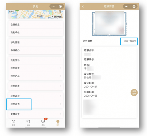 考试通过后,用户可直接在协会小程序-“我的证书”中查看或下载电子证书,实现证书的及时获取和便捷管理。这一功能的实现,简化了证书领取的繁琐流程,缩短了等待时间,让用户能够更加专注于个人成长与职业发展。
