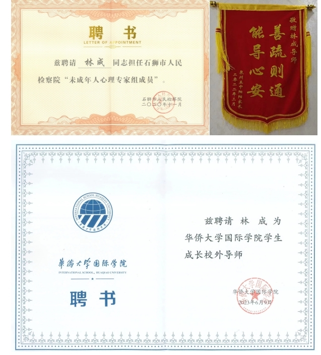 他发起创办安盈教育咨询有限公司,组建了一支专业的专家顾问团队,秉承“正念、专业、利他、感恩”的服务理念,为家庭教育和青少年素质提升贡献着自己的力量。同时,他积极参加社会公益活动,成为泉州市青年心理志愿者,获得多项荣誉证书,担任多个组织的理事和顾问。在心理健康服务的道路上,他始终保持敬畏之心,不断提升自我,以更高的水平和更强的能量去帮助更多的人。