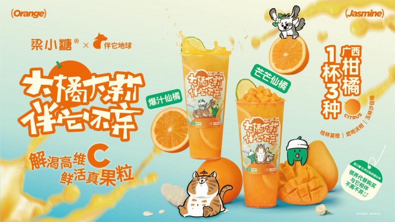 除了营造动物友好的环境,梁小糖此次上线的「大橘大莉」新品也是亮点满满,以24岁的猫届“老寿星”大橘和曾经流浪许久后被收养的“狗医生”大莉共同命名。「大橘大莉」系列共上线了2款新品:爆汁仙橘和芒芒仙橘,每一杯都包含3种广西柑橘:甜度爆表的「桂林夏橙」,晚熟高糖的「武鸣沃柑」,果肉脆嫩的「玉林沙田柚」。加上限量周边,上市当天就成为门店爆款。