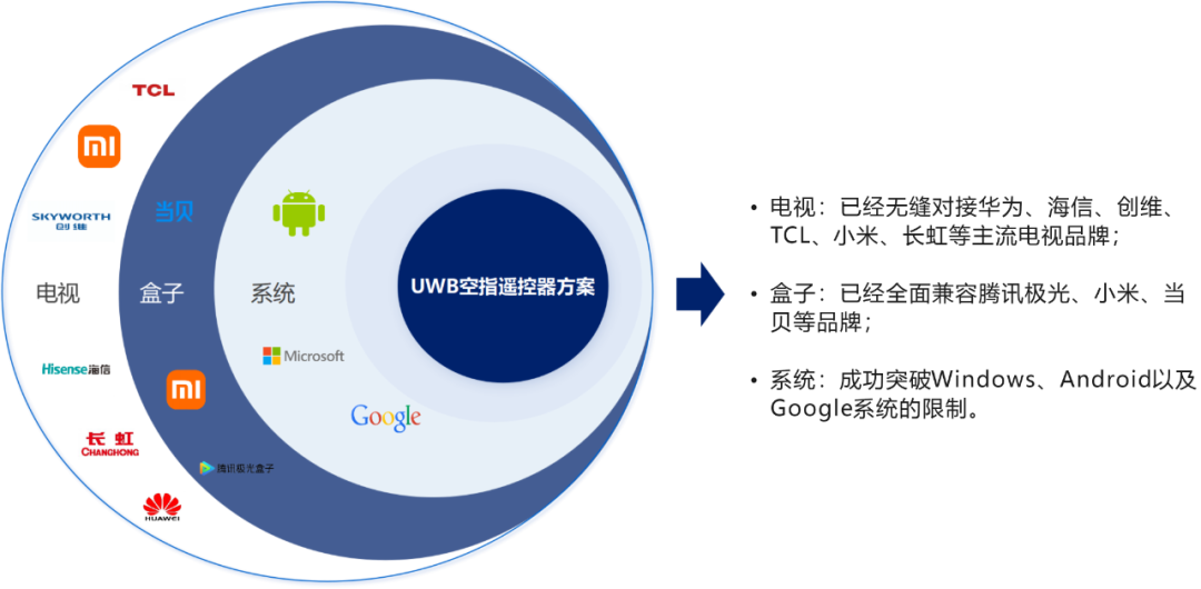更为引人注目的是,华云时空的UWB空指遥控器方案展现了其广泛的适用性和技术前沿性。该方案不仅成功实现了与海信、TCL、小米、创维、长虹等一线电视品牌的无缝对接,还与腾讯极光、小米、当贝等品牌的机顶盒产品达成了兼容。特别值得一提的是,该方案突破了Windows、Android和Google系统间的障碍,实现了跨平台的无缝兼容,极大地扩展了其应用场景和潜在市场。这一成就不仅彰显了华云时空在技术创新上的领先地位,也为用户带来了更加丰富和便捷的使用体验。