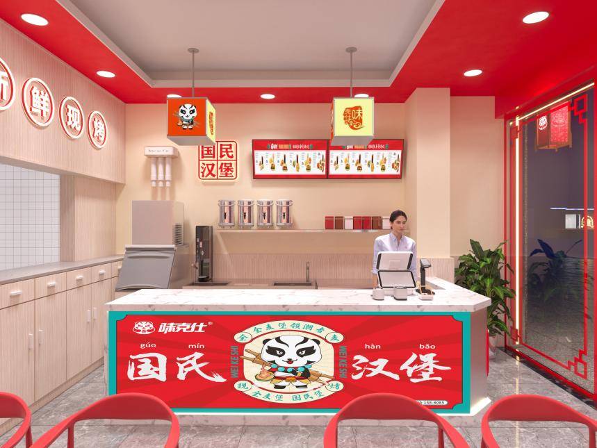 味克仕国民汉堡品牌根据市场变化需求,匠心打造独具东方韵味的国潮餐饮空间。让消费者置身舒适悠闲的国风环境。将店面设计与中国风巧妙相融,增添中国文化自信。味克仕将为合作伙伴提供八大扶持:咨询、选址、形象、培训、供货、产品、营销、运营助力合作伙伴创业成功。