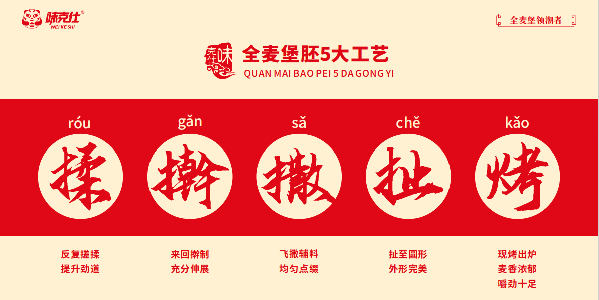 味克仕全麦堡用传统面食工艺制作,保留了丰富的粗纤维、维生素,低热量是健康饮食计划的理想选择。味克仕国民汉堡面团经48小时冷藏醒发,再经揉、擀、撒、扯、烤五道工序制作出厚薄均匀、口感劲道的中式汉堡胚,健康营养有嚼劲。味克仕国民汉堡注重中国味以此加入丰富的内陷,力求传承和发扬中餐家常味道,做符合中国人口味的国民汉堡。