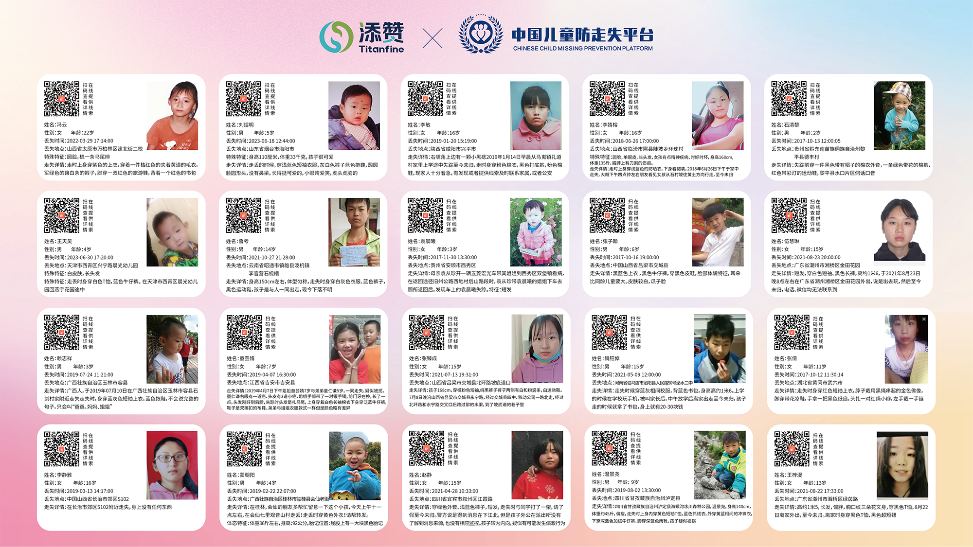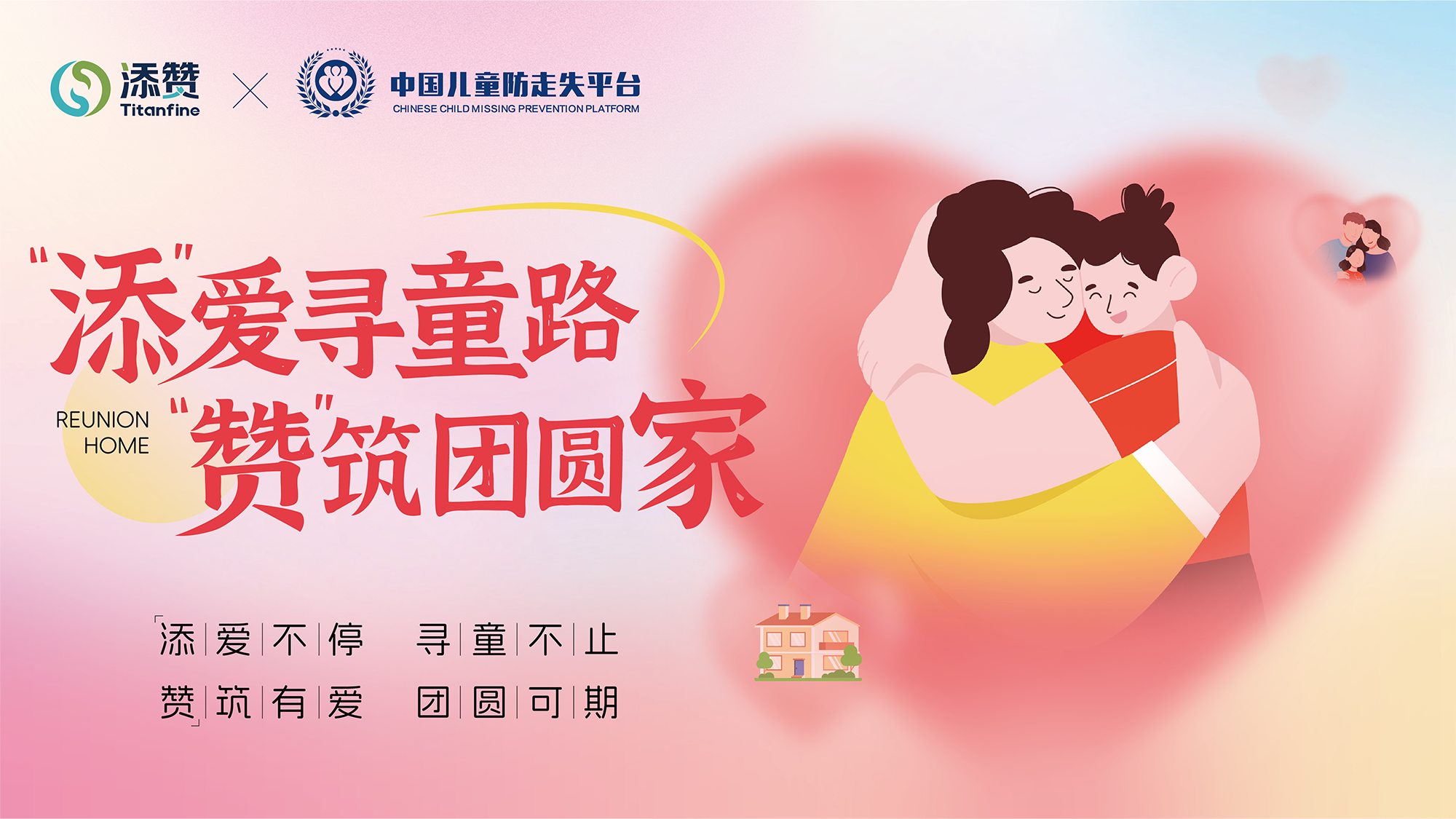 “添”爱不停,寻童不止;“赞”筑有爱,团圆可期。添赞(Titanfine)联合中国儿童防走失平台致力于构建一个集信息共享、教育普及于一体的综合性“传播链”,为儿童安全成长提供坚实有力的保障,也希望行业内外与社会各界都能加入这项伟大的公益事业,添一份心、尽一份力,共同接力希望,为建立全民参与的防丢、防拐生态体系贡献一份力量。