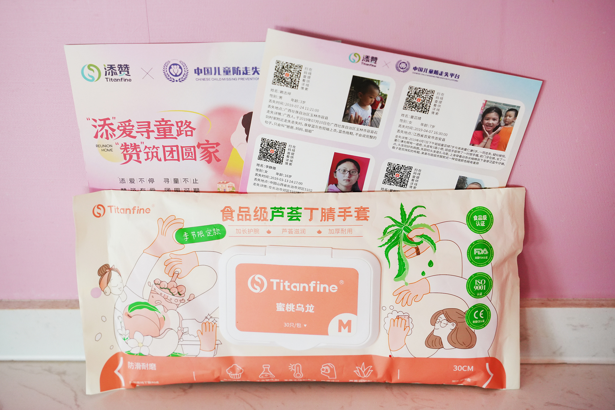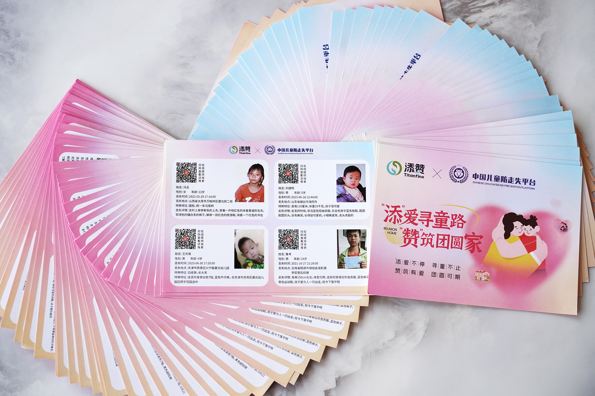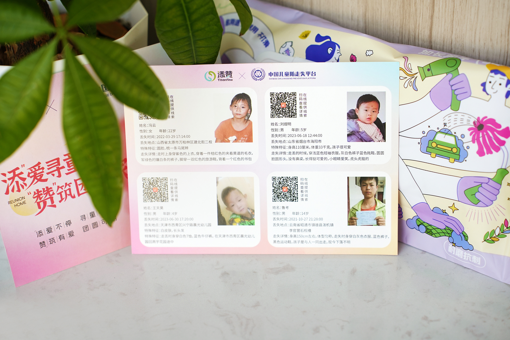 为了更多家庭的团聚和儿童安全成长,提升社会对儿童走失问题的关注,泰能医疗集团旗下的专业手部防护品牌——添赞(Titanfine)携手中国儿童防走失平台,发起“‘添’爱寻童路 ‘赞’筑团圆家”爱心公益活动,添赞(Titanfine)将走失儿童信息印成卡片,随每一份快递发出,并在各大平台进行防拐安全宣传,为建立全民参与的防丢、防拐生态体系贡献一份力量。