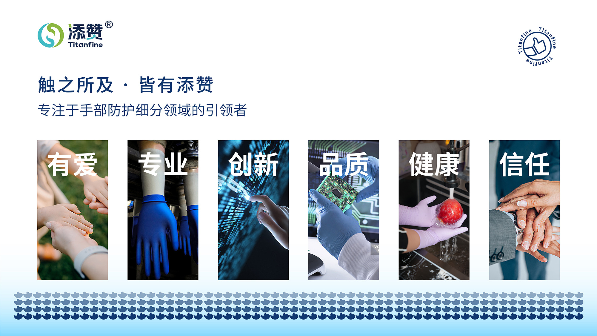 添赞(Titanfine)是河北泰能医疗用品科技集团股份有限公司(简称“泰能医疗”)旗下品牌,专注于手部防护细分领域,致力于为每个行业提供专业的手部防护解决方案。添赞(Titanfine)依托强大的1+N供应链体系,精心雕琢各行业全场景防护系列产品,精选丁腈、PVC、乳胶、TPE、PE 等多种材质,从日常家务清洁的悉心呵护,到食品加工处理的严格标准;从酒店餐饮的卫生保障,到美容美发的专业防护;从工业生产的坚实陪伴,到医疗领域的无菌屏障;再到光学电子、航空航天等高科技领域的精密需求,添赞产品都有着广泛的应用,为每一个细分行业与场景提供专业、高效、贴心的手部防护产品与服务。