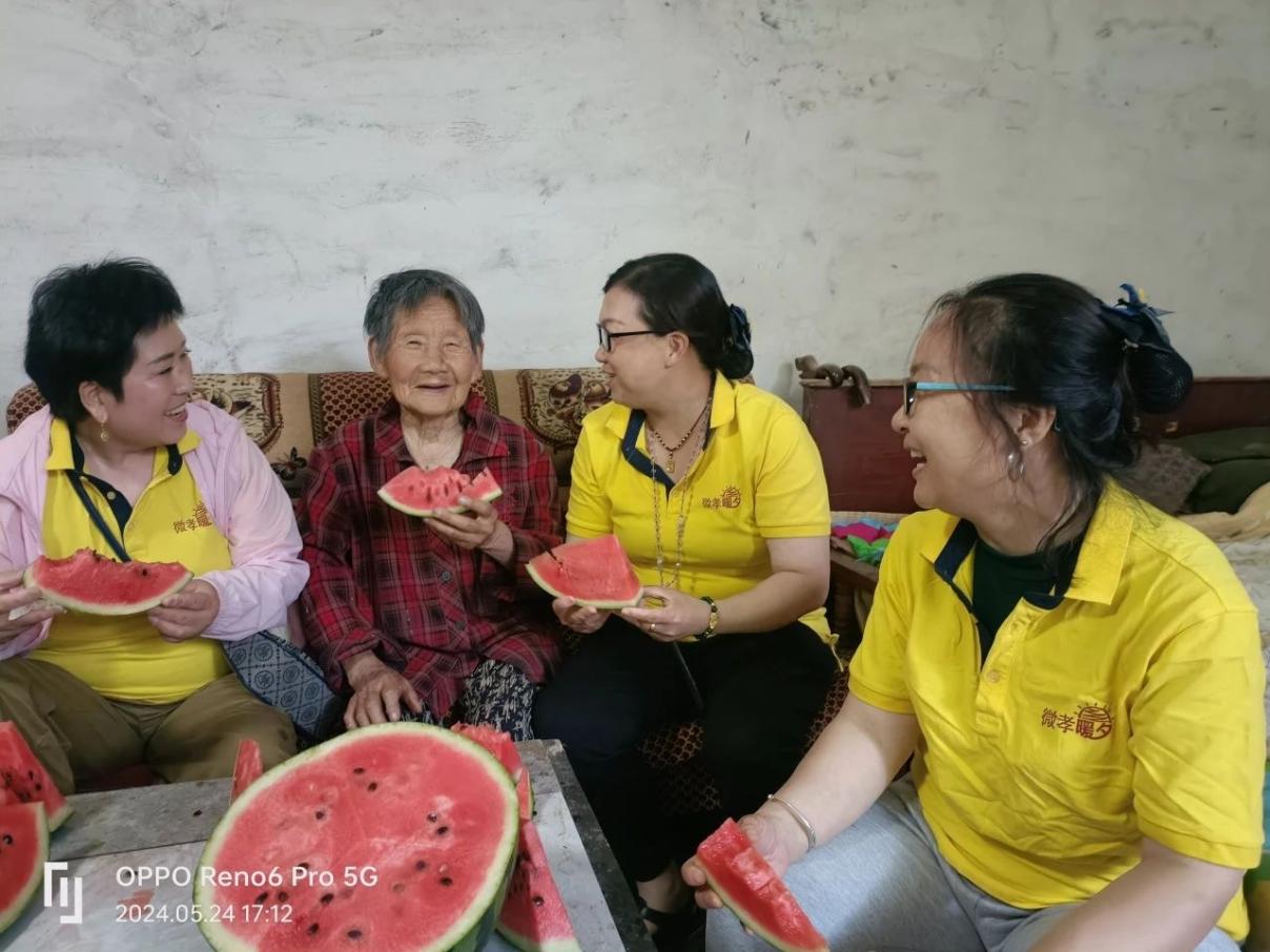 蹲下身子,促膝环绕,握着爷爷奶奶的手,吃着西瓜,了解他们近期发生的事情,体会着他们这份期盼和亲情,志工们的这份辛劳伴着笑声,给了爷爷奶奶们一份安心,一份寄托。