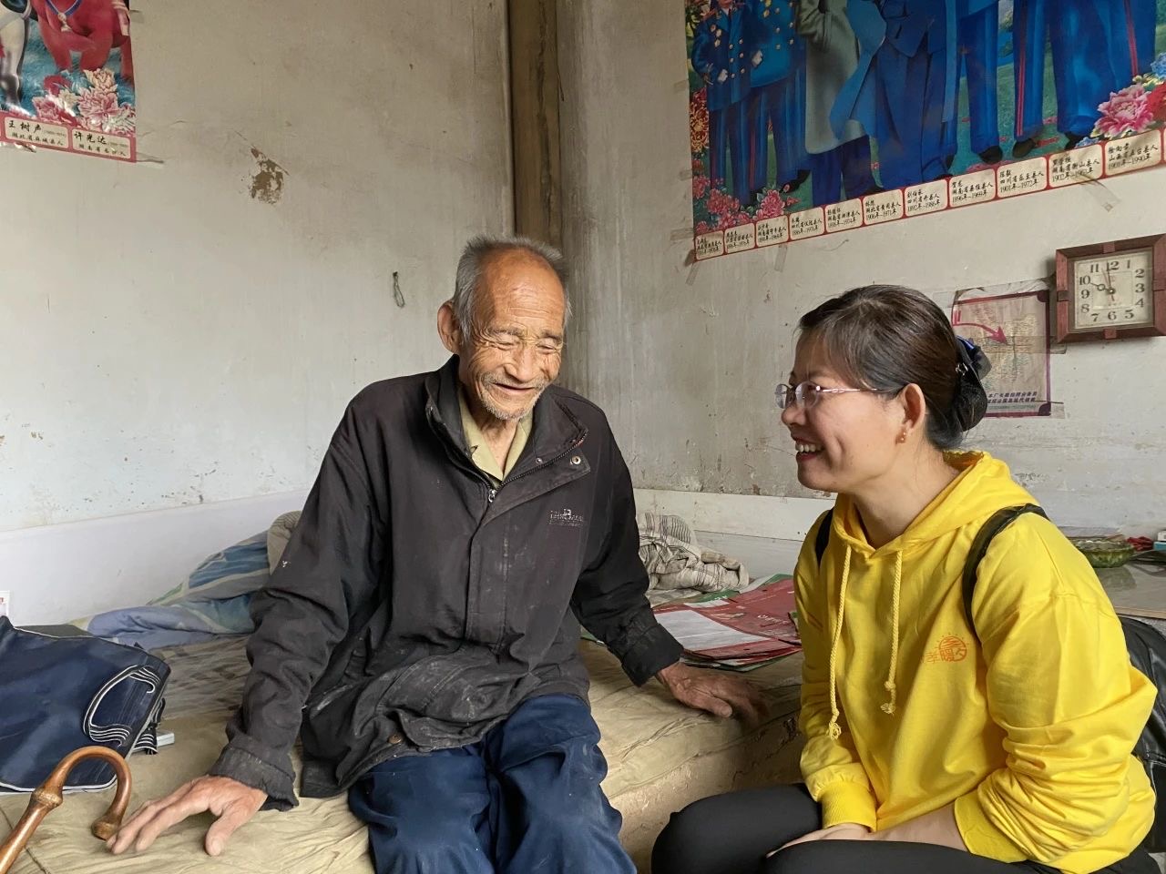 在每一次探访中,志工们都采取蹲姿或坐姿,确保自己的视线低于老人,以此表达对老人的尊重与关爱。这种细节的把握,除了给他们足够的尊重和安全感外,更让他们感受到儿女绕膝的家人般的温暖,也让志工们与老人们之间建立了深厚的情感纽带。