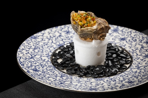 深圳美高梅酒店的中餐主厨梁志坤,独具匠心,以东坡诗意为灵感,精心创作了「明炉黄椒酱焗本港响螺」。在《念奴娇·赤壁怀古》中“人生如梦,一尊还酹江月”这句词,深刻地展现出人生苦短的无奈、壮志未酬的悲愤以及对美好事物的深深留恋。于苏东坡笔下,酒并非仅仅是消愁解闷的工具,更是其内心丰富情感与精神追求的显著象征。梁师傅特意选取了海南的鲜活响螺,将20年陈酿的花雕酒入菜,让花雕酒在螺片上燃烧,使浓郁的酒香充分渗透进螺片,致使海螺片散发出醇厚浓烈的花雕酒香气;再佐以黄椒酱、圆椒、鸡汤,历经腌制、焗制、文火慢炖等工序,层层风味相互交织。