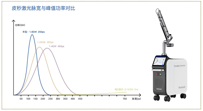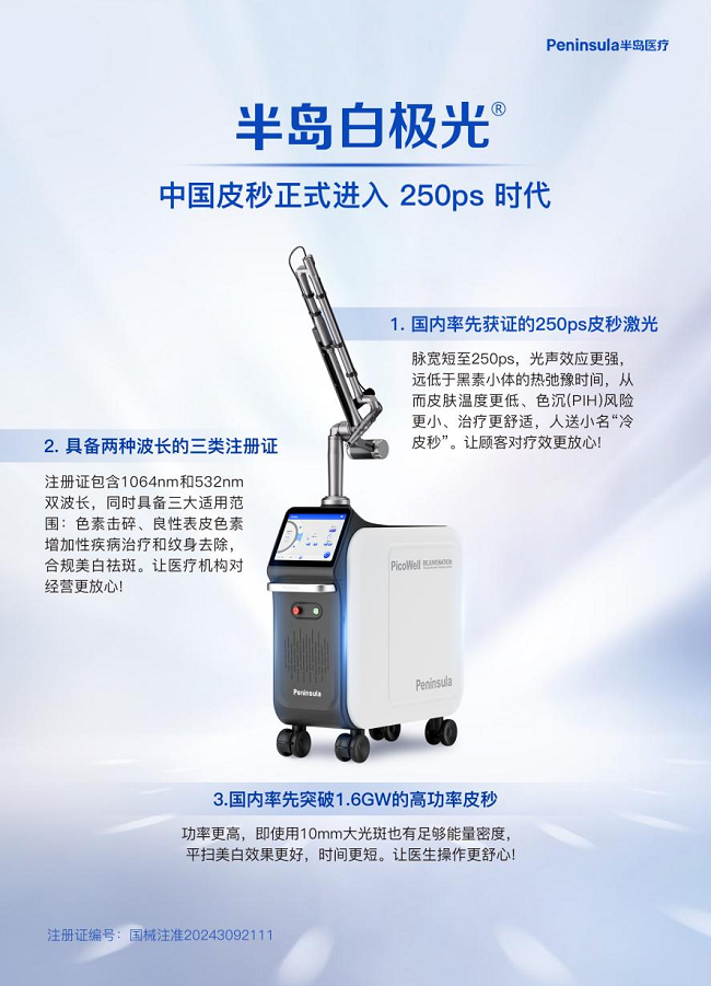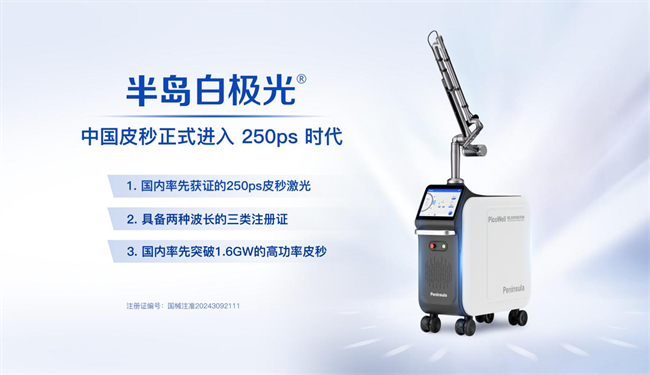 半岛皮秒激光治疗仪(商品名:半岛白极光)正式获国家药监局批准,是国内首个双波长、拥有最短脉宽250ps的皮秒激光!