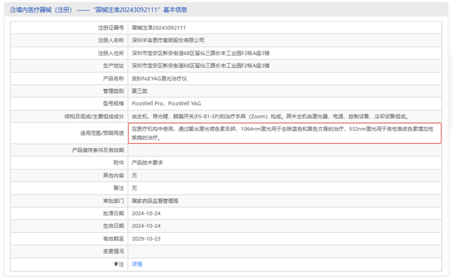 10月24日,国家药监局发布的医疗器械批准证明文件中显示,深圳半岛医疗集团股份有限公司关于皮秒Nd:YAG激光治疗仪的注册申请获批(国械注准20243092111)。