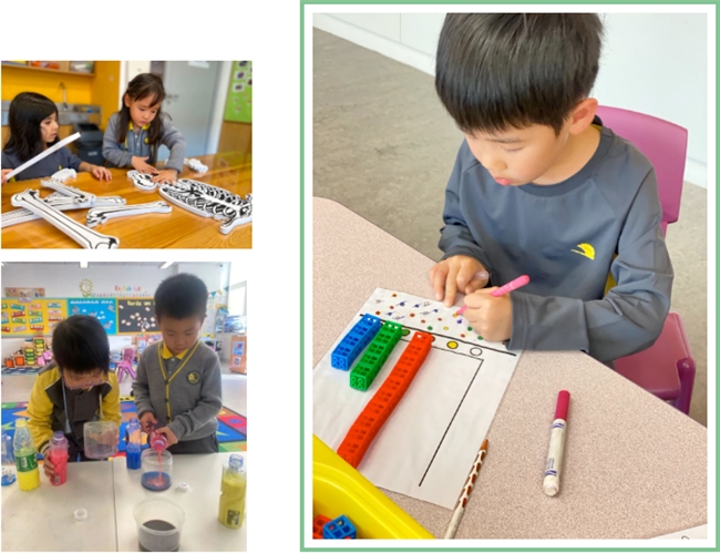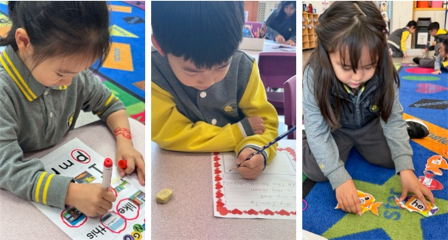 在我们的阅读时间里,孩子们沉浸在绘本的迷人世界中,引人入胜的故事丰富了他们的理解并激发了他们的想象力。写作则让孩子们表达自己的情感和想法,鼓励他们创造性地与文字互动,赋予他们将自己的想法写在纸上的能力。在这里,语言不仅是一种交流工具,也是孩子们探索和理解周围世界的重要钥匙。