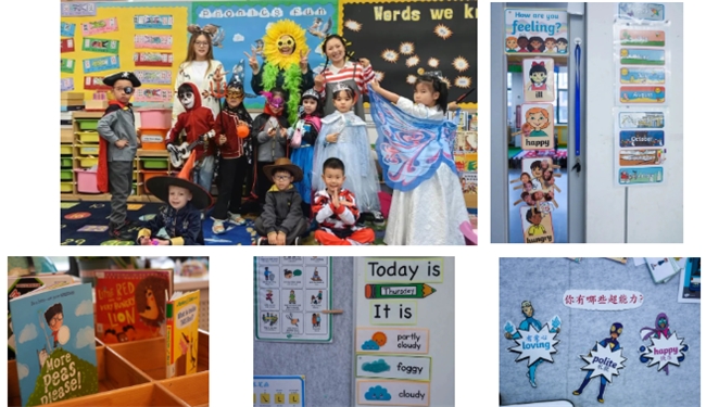 班级每一角落都充满了英语元素,区域标识英文化。设有绘本角、日期、天气、心情等主题布置,孩子们在自然的情境中轻松运用英语,培养英文思维。大量孩子阅读的精美绘本、旋律欢快的英文儿歌、角色扮演的英文游戏、随处可见的字母表单词卡……都让孩子们在轻松愉快的氛围中运用英语,提高语言实际运用能力。