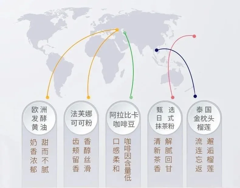 精选欧洲、日本、泰国、阿拉比卡等地的高级原食材。可以这么说,除了做曲奇的师傅,其他全部都是进口的!