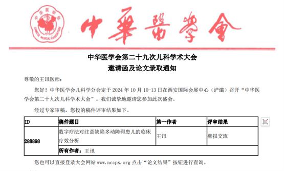 以上研究结果成功通过中华医学会儿科学分会评审并于中华医学会第二十九次儿科学术大会中发表,报告中详细说明并记录本次真实世界研究的数据,充分论证数字疗法对注意缺陷多动障碍患儿的临床疗效。