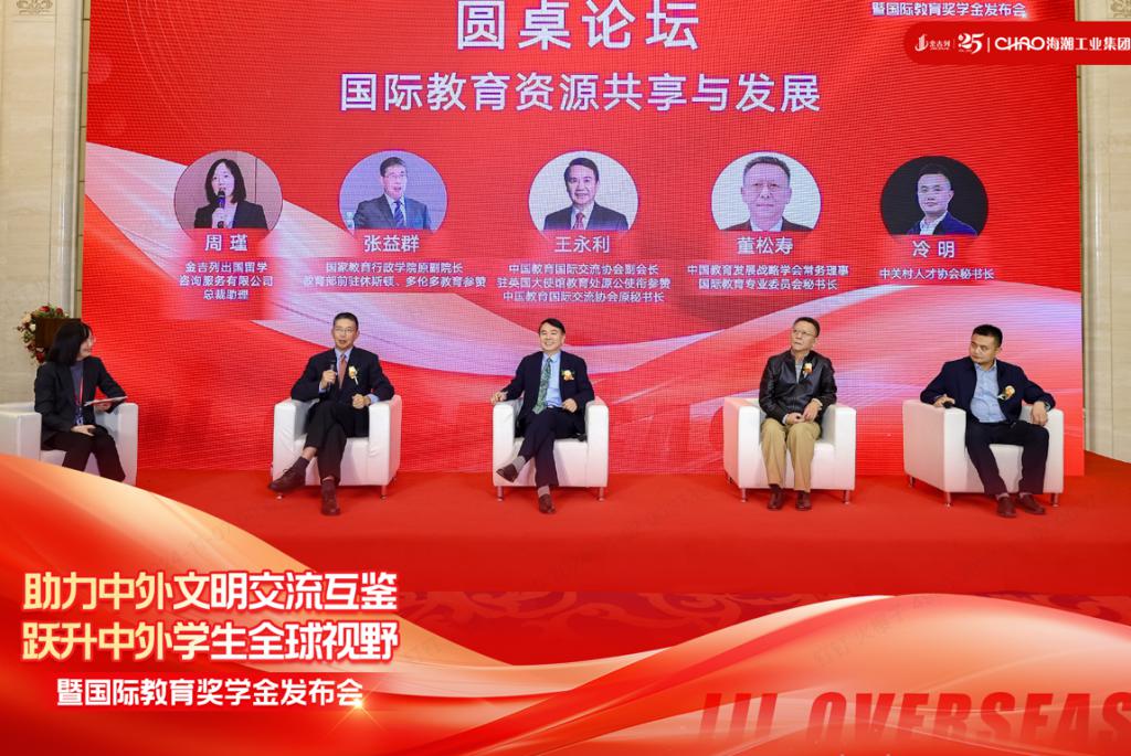 会议期间,欧美同学会副会长、留加分会会长、博鳌亚洲论坛高级顾问姚望先生;中国教育国际交流协会副会长、驻英国大使馆教育处原公使衔参赞、中国教育国际交流协会原秘书长王永利先生;金吉列留学董事长兼总裁郑应文先生;海潮工业集团有限公司副总裁、全球公共事务部总经理盛潇萱女士;中国驻纽约总领事馆教育组原一秘领事、中国驻洛杉矶总领事馆教育组原组长、参赞袁东先生;高校毕业生就业协会国际合作与交流工作委员会副秘书长甘霖女士;中国地质大学外国语学院党委书记刘金艳女士;北京海归协会会长于斌先生共同登台,正式开启了国际教育奖学金项目的序幕,标志着这一公益事业的正式扬帆起航。