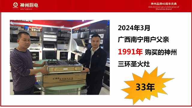 广西南宁客户(左)换赠的一台33年前的神州三环火灶具,这还是他父亲当年购买的。