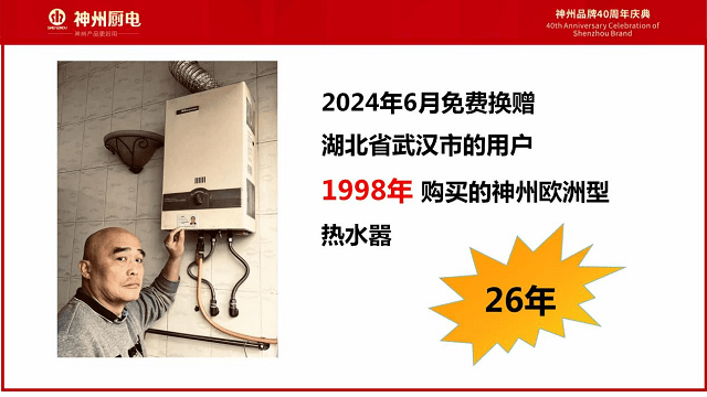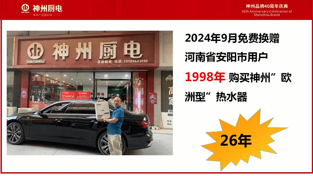 这位河南安阳用户购买的也是神州出口的“欧洲型”热水器,一用就是26年。神州公司安阳代理商知道后,专程驱车前往为他赠送了一台新热水器。
