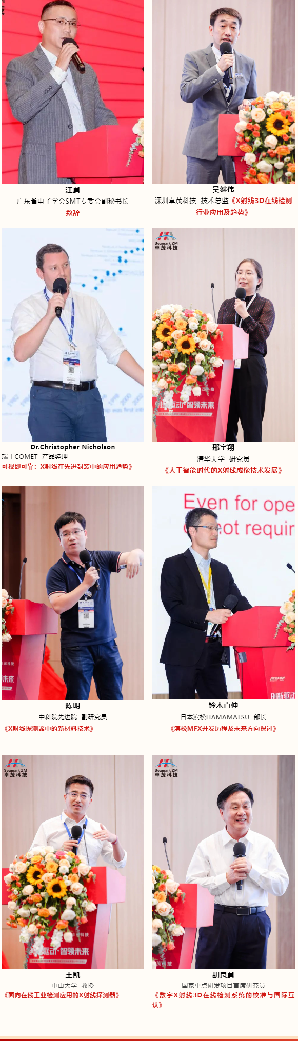 当天下午,在X射线3D在线检测国际学术交流会上,国家重点研发项目首席研究员胡良勇、广东省电子学会SMT专委会副秘书长汪勇、卓茂科技技术总监吴继伟、瑞士COMET 产品经理Dr.Christopher Nicholson、清华大学研究员邢宇翔、中科院先进院副研究员陈明、日本滨松HAMAMATSU部长铃木直伸、中山大学教授王凯等分享X射线3D在线检测技术领域成果、新进展以及共同探讨行业未来发展趋势。
