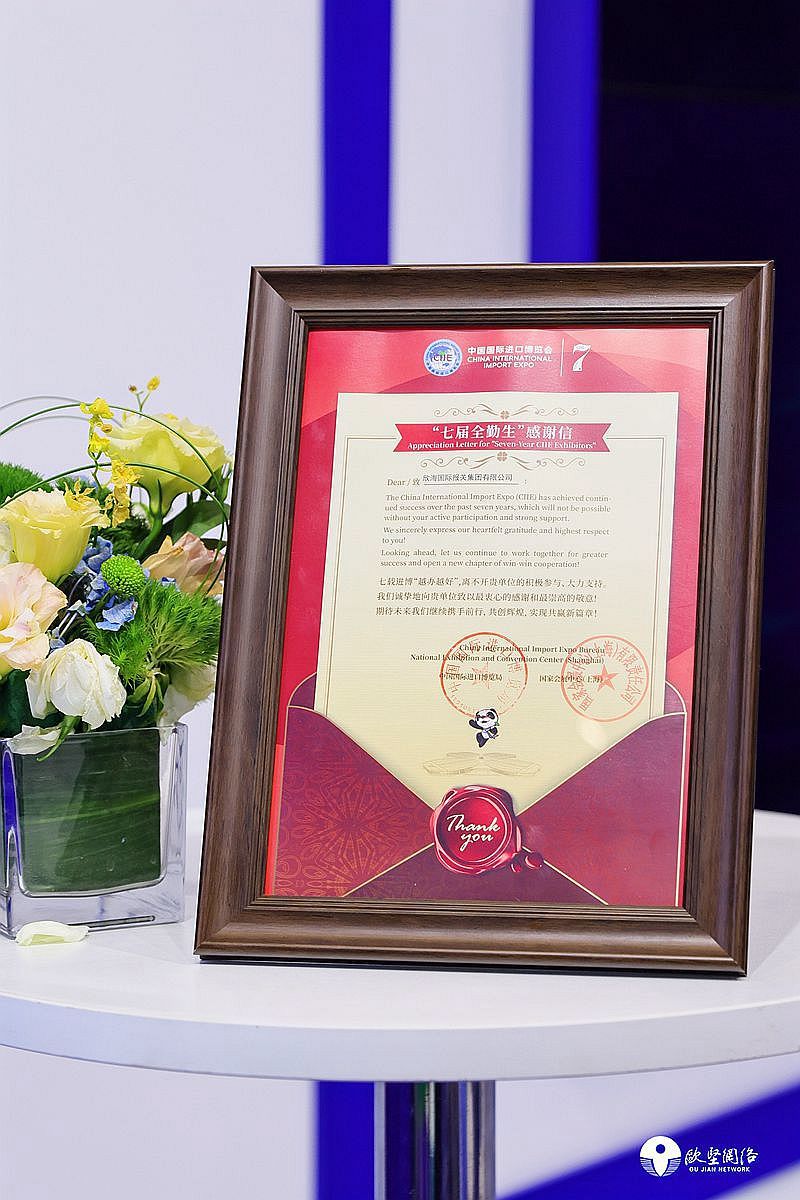 近日,备受全球瞩目的第七届中国国际进口博览会(以下简称“进博会”)在国家会展中心(上海)圆满落幕。作为跨境贸易供应链解决方案的领军者,欧坚集团在进博会中拥有展商、采购商、综合贸易服务商、行业性招商合作伙伴、进博“6+365天”常年交易服务平台等多重身份,全方位展示了其在国际贸易领域的深厚实力与广泛布局。今年,欧坚集团还新增了珠宝展区珠宝留购服务的指定服务商角色,凭借专业高效的表现获得了上海海关、上海宝交所以及众多参展商的高度认可。欧坚集团以连续七载的积极参与和卓越贡献,荣获进博局颁发的“七届全勤生”感谢状。这一殊荣不仅彰显了进博局对欧坚集团持续支持与参与的高度认可,更体现了对其在国际贸易领域深耕细作、不断创新精神的崇高赞誉。