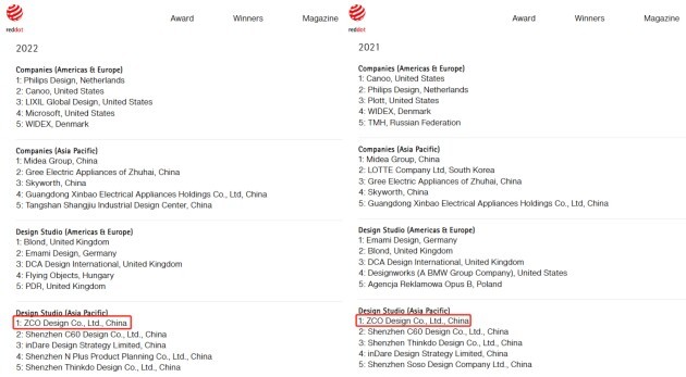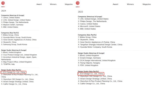 从红点奖官网上得知,自2021年起到今年2024年,智加设计已经连续4年获得“红点奖亚太地区排名第一的设计机构”的殊荣,不仅让国际市场对中国设计企业刮目相看,也为广大中国设计企业树立了创新发展的标杆。