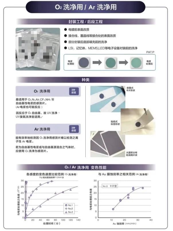 必须先确认接触有测定和蚀刻量测定的测量范围和感测片变色范围是否对应。由于变色范围依客户端使用的装置、电浆处理的条件不同(气体种类、流量、处理时间、出力等),基本上必须请客户端自行测试。即有评估方法与感测片变色范围相应情况下,可作出彼此相关线性,进而将既有的测定值和色差进行换算。