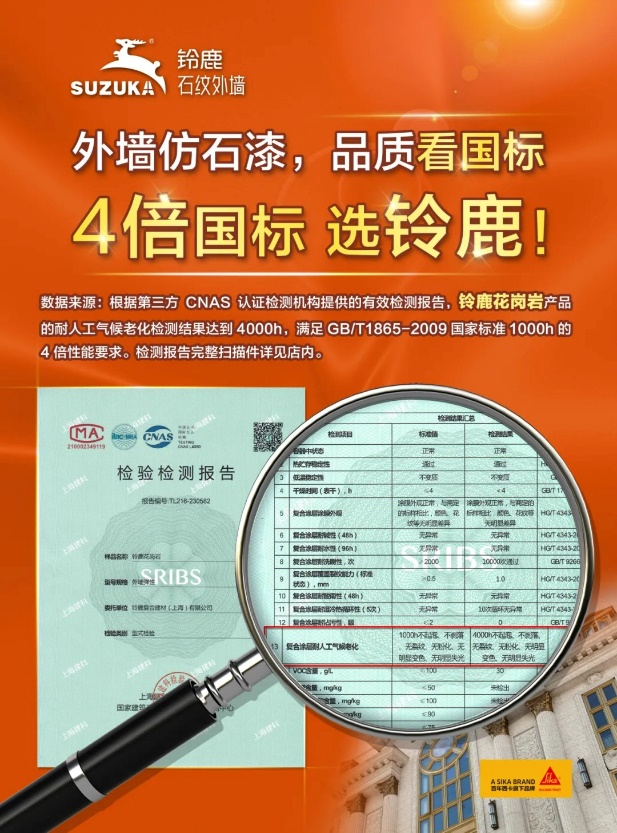 面对仿石漆行业产品参差不齐、消费者选择困难的现状,自3月起,铃鹿就举办了“4倍国标选铃鹿”的专题活动,积极组织铃鹿专员,从报告真伪、检测机构权威性、产品性能、质保年限等多方面进行科普宣讲,倡导消费者从仿石漆产品检测报告来聚焦产品性能。一款合格的仿石漆产品,每年都会更新相关的国家检测报告,希望通过铃鹿专员不断的努力,也让消费者们能通过这份官方的检测报告清晰的分辨出产品的性能如何。