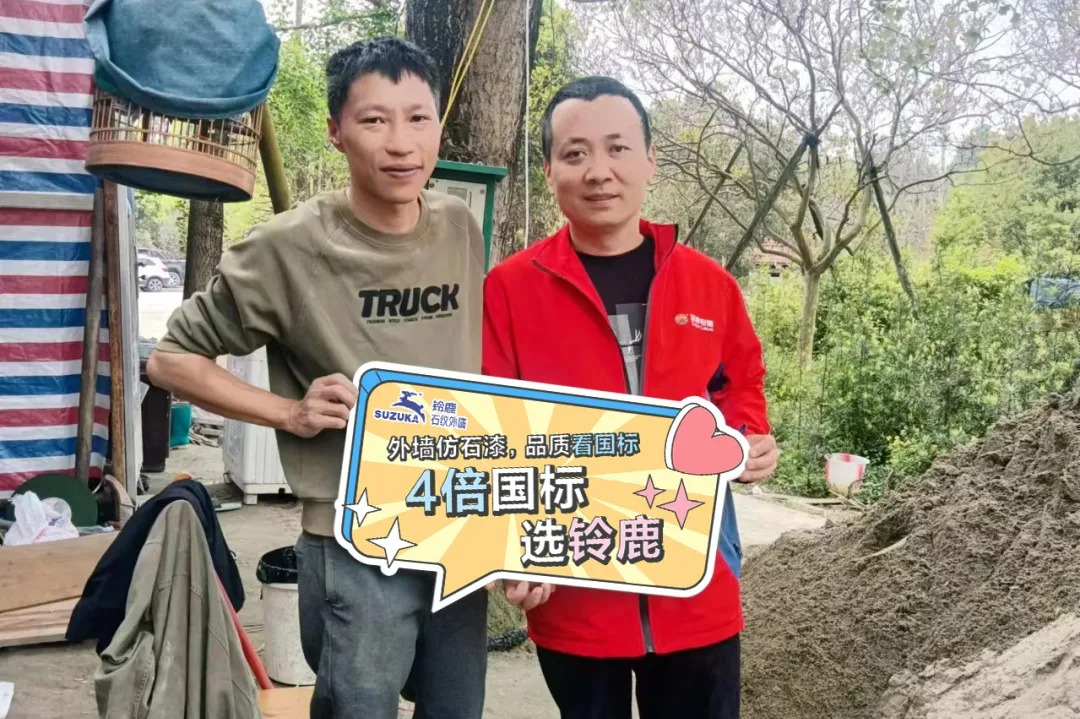 来自铃鹿石纹外墙儋州和庆镇专卖店的谭孟优,一直以客户为中心,守护好客户的信任。为了让业主了解外墙仿石漆、了解铃鹿,也为了让业主们在琳琅满目的产品选择中不踩坑,他走过乡间小路、跑遍工地现场,为“4倍国标选铃鹿”的科普宣传走南闯北,脚步从未停歇,只为让大家选到一款放心的好产品。